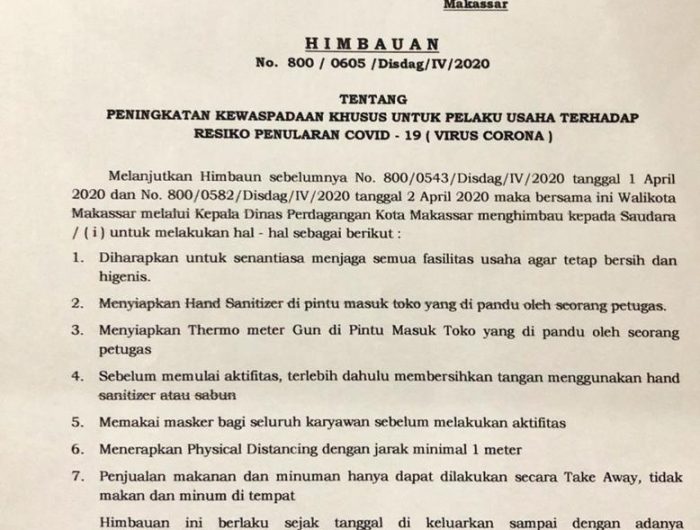 Kepala Dinas Perdagangan Makassar, A. M. Yasir, mengatakan, imbauan ini diberlakukan agar penyebaran virus corona tidak makin menyebar lagi.