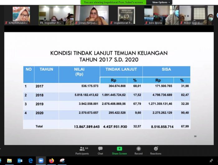 Sementara, Plt. Inspektur Provinsi Sulsel, Sri Wahyuni Nurdin, mengatakan, progres tindak lanjut temuan APIP tahun 2017 – 2020 per November 2020 ini, yakni pada 2017 itu terdapat 994 temuan dengan 1.345 rekomendasi dan masih 12 persen belum selesai ditindaklanjuti.